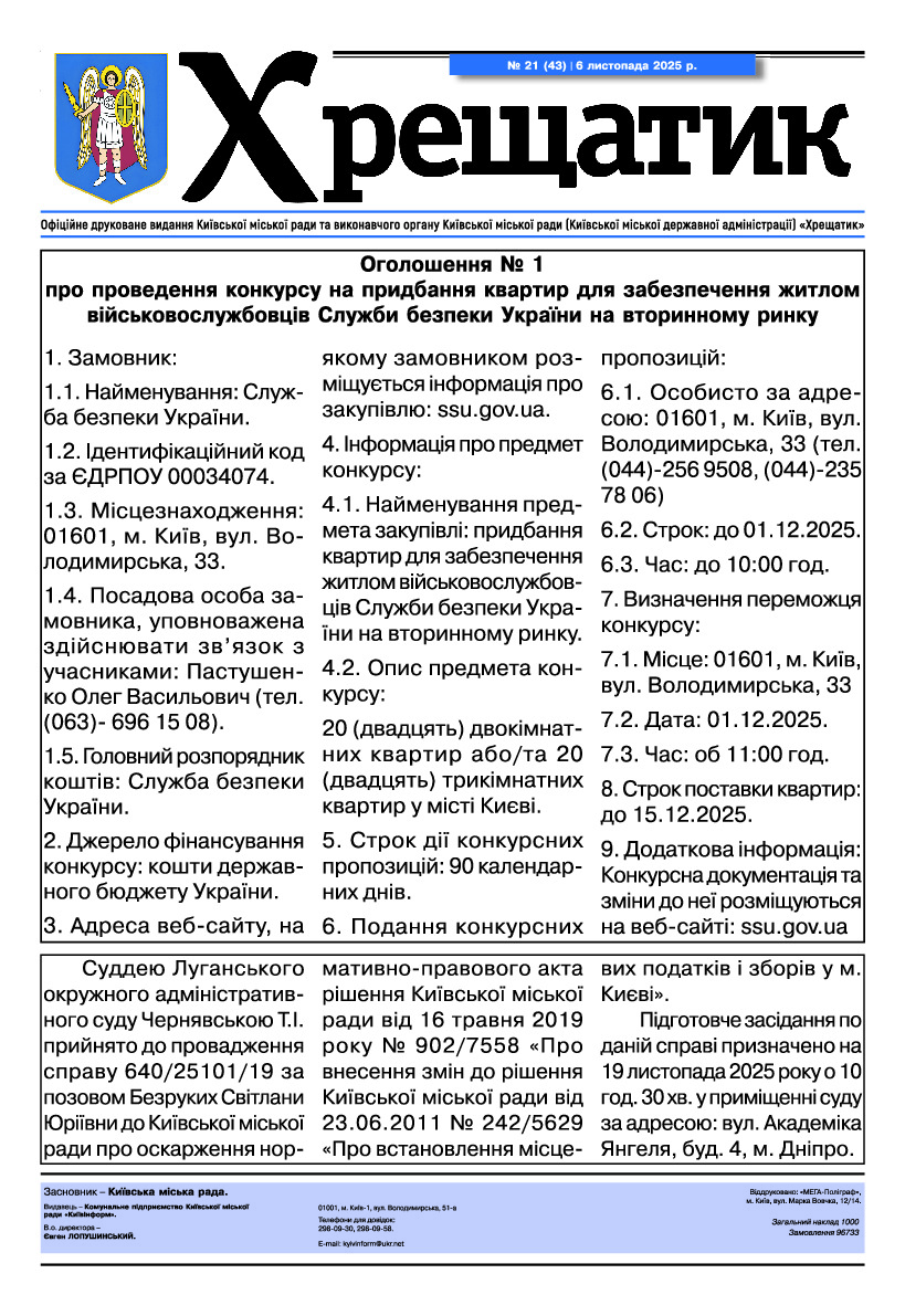 © 2019 – 2025  Хрещатик — міська газета | м. Київ | Засновник — комунальне підприємство Київської міської ради «Київінформ».