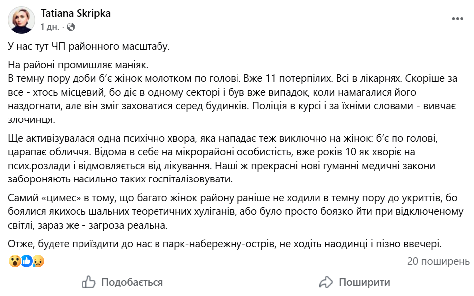 Авторка допису про «маніяка», така собі Тетяна Скріпка на своїй сторінці у Facebook пізніше заявила, що взяла інформацію про 11 постраждалих з коментарів у місцевих групах.
