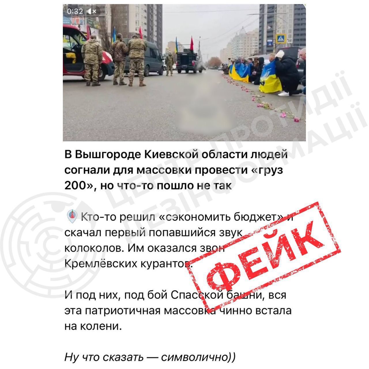 У проросійських Telegram-каналах поширили черговий фейк, нібито у Вишгороді на Київщині під час церемонії вшанування полеглого військового «зігнали людей на масовку», а в момент хвилини мовчання «увімкнули кремлівські куранти».