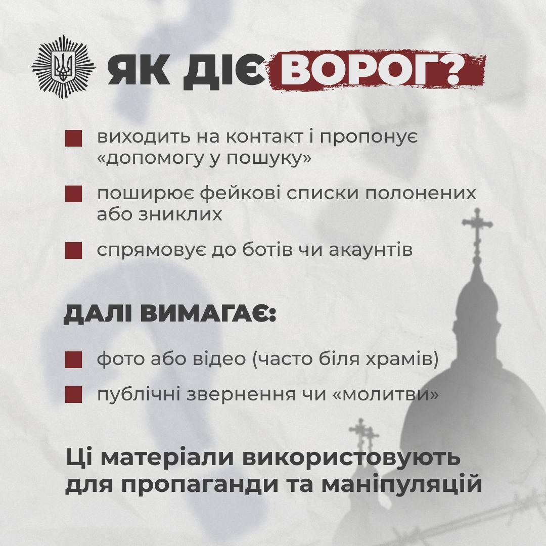 «У подальшому родинам висуваються так звані „умови підтвердження“: зробити фото з записками (часто біля храмів), записати відео з молитвами або публічними зверненнями. Такі дії є елементами маніпуляції», — зазначив Артур Добросердов.