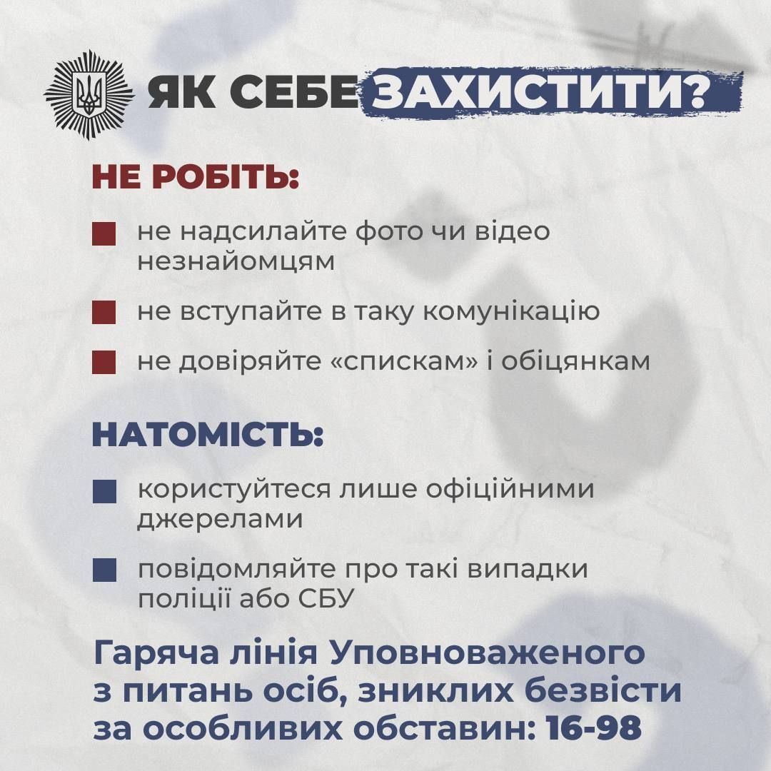 Уповноважений з питань осіб, зниклих безвісти за особливих обставин Артур Добросердов розповів, як розповсюджуються списки осіб, які начебто перебувають у полоні або на тимчасово окупованих територіях, після чого пропонується звернутися до спеціальних ботів чи акаунтів.